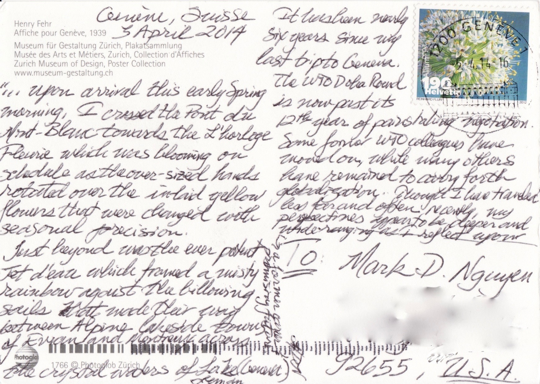 It has been nearly six years since my last trip to Geneva.  The WTO Doha Round is now past its 12th year of painstaking negotiation.  Some former WTO colleagues have moved on, while many others have remained to carry forth globalization.   Though, I have traveled less far and often in recent years, my perspectives appear to be deeper and wide-ranging as I reflect upon a former career and promising future.  MDN”